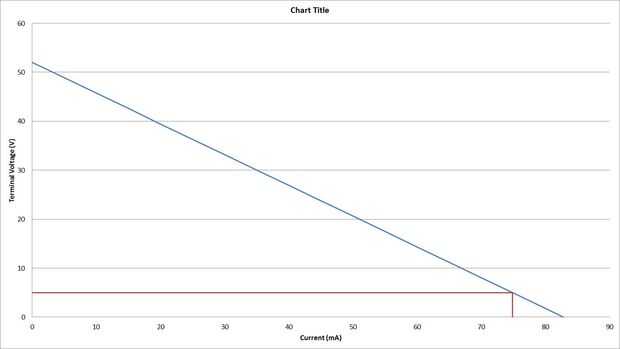 Entonces conectado resistencias de varios para ver cuál sería la salida con cargas diferentes. Determiné que la tensión de alimentación no regulada. Esto significa que los cambios de voltaje dependiendo de la resistencia del circuito que esté alimentando. Después de algún cálculo, trabajé que la señal base que sale de mi toma de teléfono muy de cerca se asemeja a una 52 voltios DC fuente con una 628 ohm resistencia interna.