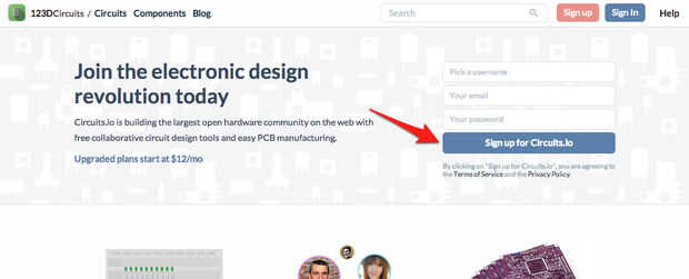 Primero tienes que crear una cuenta en https://123d.circuits.io también puede utilizar Facebook o Twitter para iniciar sesión.