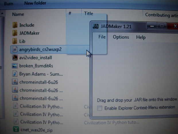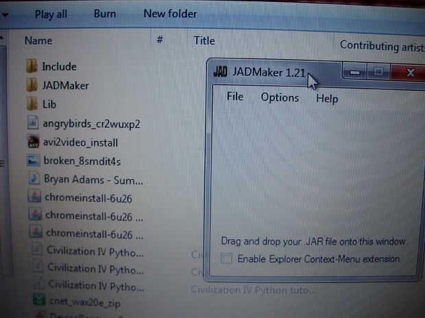 luego encontrar la descarga del juego en tus documentos. abrir JADmaker y arrastrar el archivo desde la ventana de documentos a la ventana del JADmaker, debajo el archivo en documentos un archivo con el mismo nombre pero diferente extensión y aparecerá el sí mbolo, dejar esta ventana abierta.