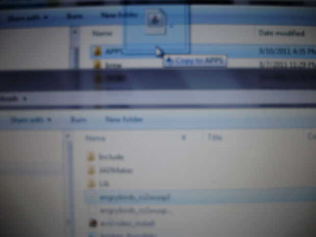 Enchufe su sd tarjeta en el ordenador y abrir otra ventana de documentos, vaya a la tarjeta sd y hacer un nuevo archivo, asígnele el nombre APPS, en todas las capitales, es donde pones tus juegos. ahora arrastre los archivos .jar y .jad del juego desde una ventana de documentos a la carpeta de aplicaciones, asegúrese de que se encuentran allí.