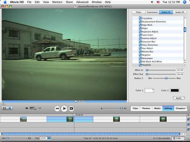 Seleccione el efecto de la "Mirilla" de la pestaña de "Video FX". Antes de hacer clic en aplicar, deslice el "Radio 2" control deslizante a la derecha por lo que solo sombrea las esquinas de las imágenes.