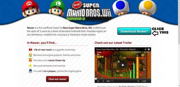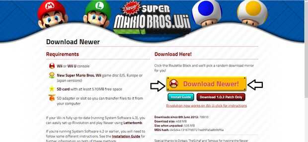 1 descarga la descarga del canal 2 de homebrew Riivolution http://rvlution.net/riivolution.zip 3 crear una carpeta "apps" en su tarjeta SD. Colocar el contenido de la descarga (carpeta "riivolution") en él. 4 descargar el paquete más reciente Super Mario Bros de http://www.newerteam.com/download.php y localizar * carpetas "NewerSMBW" y "riivolution", luego ponerlas en la raíz ** de la SD. 5 carpetas "NewerSMBW", "riivolution" y "aplicaciones" en la raíz (opcionalmente también, "privado"), "riivolution" carpeta "aplicaciones". 6 Inserte la tarjeta SD en tu Wii y lanzar el Homebrew Channel. 7 carga Riivolution 8 Introduzca el disco de New Super Mario Bros por menor. Asegúrese de que la opción se establece en "Activado" y haz clic en "Launch" en esta pantalla cuando se carga. 9 más nuevo es y listo para ser jugado. Divertirse