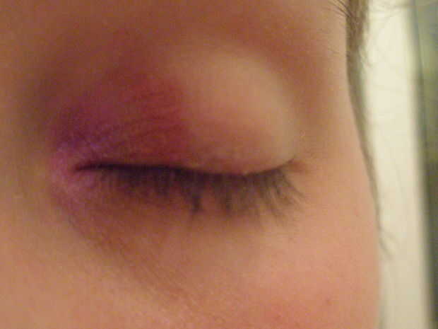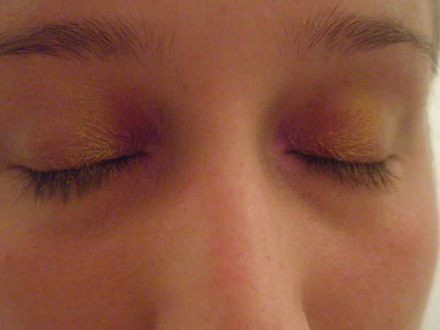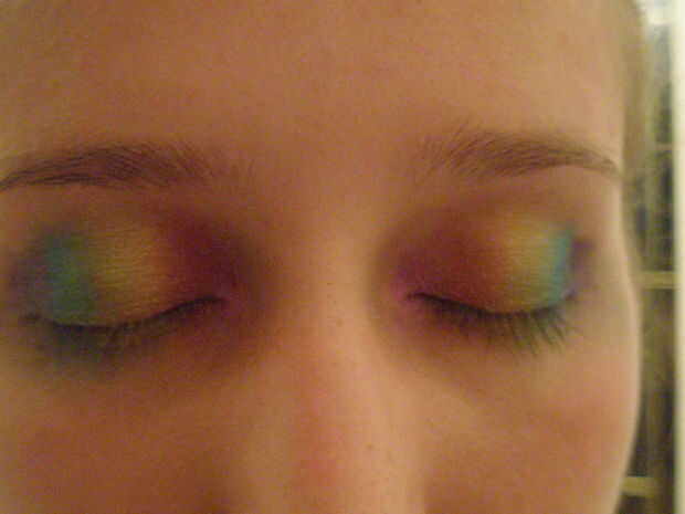 me gusta poner mis colores de arco iris en el ángulo interno del ojo, para que los colores más oscuros como azul y morado son en las esquinas exteriores que hará que tus ojos se agrandan.  Al aplicar la sombra de ojos, asegúrese de que obtener suficiente pigmento en el pincel.  Asegúrese de que sus colores son mezclados adecuadamente utilizando el vacío cepillo cepillo ligeramente sobre las líneas entre los colores.  No te preocupes si sombra adicional caiga sobre tus pómulos.  Usted puede limpiarlo posteriormente.