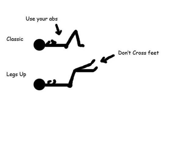 Pies y espalda con tierra, las rodillas se doblan hacia arriba y los brazos doblado alrededor de pecho. Los brazos detrás de la cabeza causa el uso de los músculos de brazos tan doblan en el pecho. Inicio lento y constante es mejor siempre, quieres ser capaz de sentir su abs realmente tirándolo a usted a través de y hasta. Para crear una buena quemadura generalmente que sólo tienes que ir a mitad de camino hasta las rodillas, nada más y puede asumir su usando otros músculos, así mantener bajos.