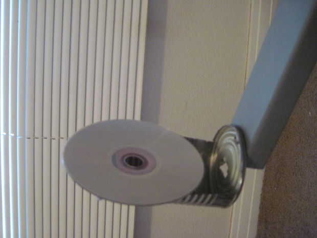 Si tu CD es enfriar la lata abierta y caliente pegamento el CD parabólico a la lata con el agujero de la curva línea del disco y el agujero en la parte posterior de la lata.