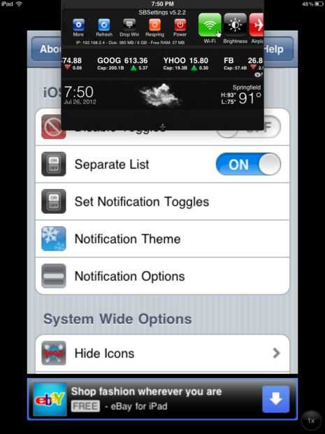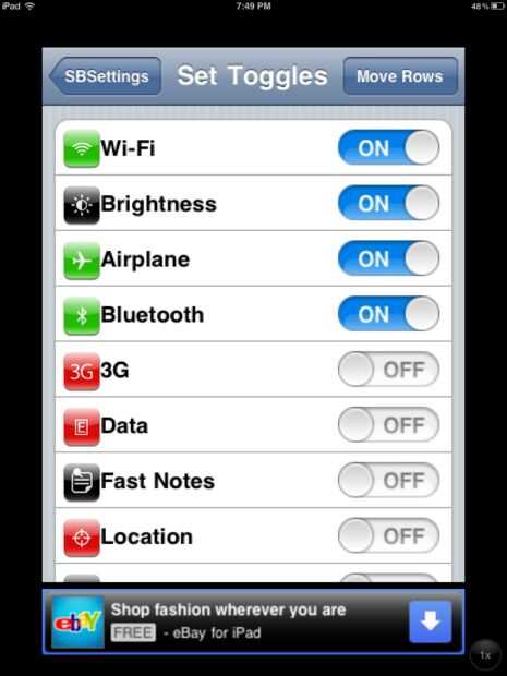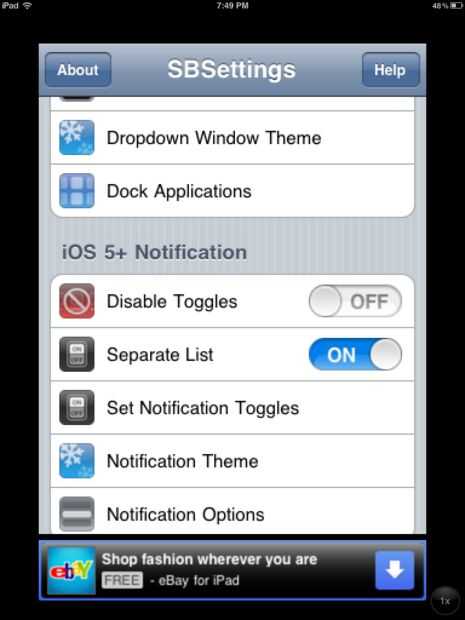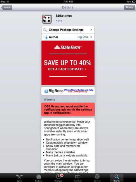 Que desea instalar SBSettings por BigBoss. (Esto es una fuente ya agregada). Esto instalará también activador como una aplicación. Después de instalar respring a su dispositivo. Después de este ir a SBSettings y asegúrese de que mostrar icono está en desactivar la ventana está en desactivar la conmutación está apagada y lista independiente está en el. Para cambiar rápidamente las opciones de configuración pueden ir a "Configurar la notificación cambia" y activar los Widgets que gustaría ver en el centro de notificación.