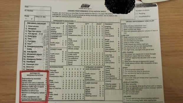 -La prueba es rápida. 95% de los estudiantes no de descalificación automática. Asegúrese de no hacer nada que se muestra en el cuadro rojo arriba. Recuerde que "intervención del examinador" pueden ellos decir "reloj hacia fuera!" o "es necesario comprobar su punto ciego". También, conduciendo lentamente es una automática no!