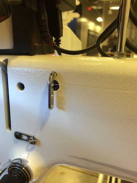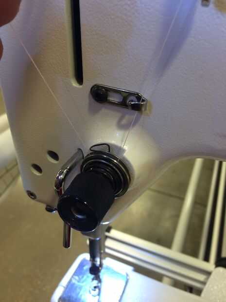 1. Enhebre el hilo por el orificio superior de la guía del hilo tres orificios. Encuentro esto crea menos tensión allí y me permite controlar más precisamente con el disco de tensión.