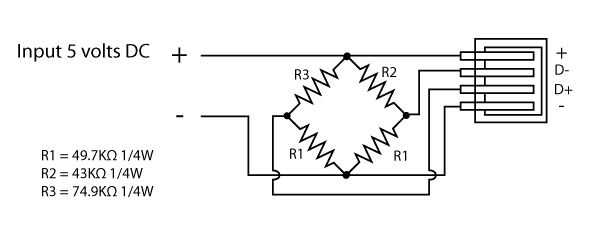 Los valores de las resistencias en el esquema siguiente pueden ser aproximados. Ésos son sólo los valores medido de las resistencias en mi cargador muerto. Usted también podría enlazar diferentes valoradas resistencias en serie en los ohmios exactos (22 K + 22 K = 44 K, perfecto para R2.) También, resistencias 1/8W funcionará muy bien.