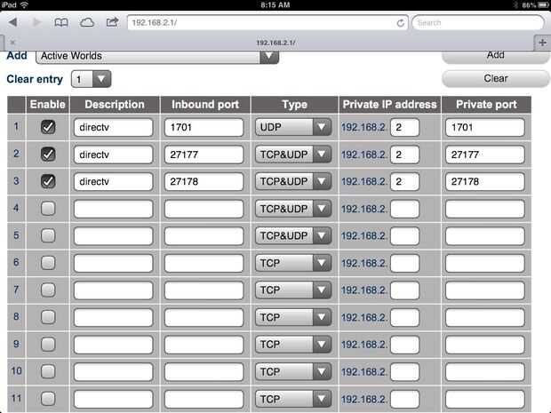 Ahora que estamos en servidores virtuales aquí puedes ver a la derecha una rejilla que puede rellenarse. Vas a agregar tres líneas a esta red. Compruebe la casilla de habilitar tres líneas en la caja de nombre tipo directv en todas las líneas en el primer cuadro en el menú desplegable menú Seleccione udp en las otras dos cajas seleccione tcp en el en la fila donde udp está seleccionado tipo 1701 en las casillas de Puerto entrante y otra vez en las cajas puerto privado. Tipo 27177 en uno de los las otras filas en el mismo puerto de casillas. Poner el número 27178 en la otra fila en los dos puntos de la misma, luego en cada fila hay solamente una caja para ser llenado. La dirección IP privada en estas tres cajas poner 2 parece confusa pero no es... basta con mirar la imagen.
