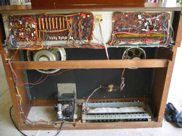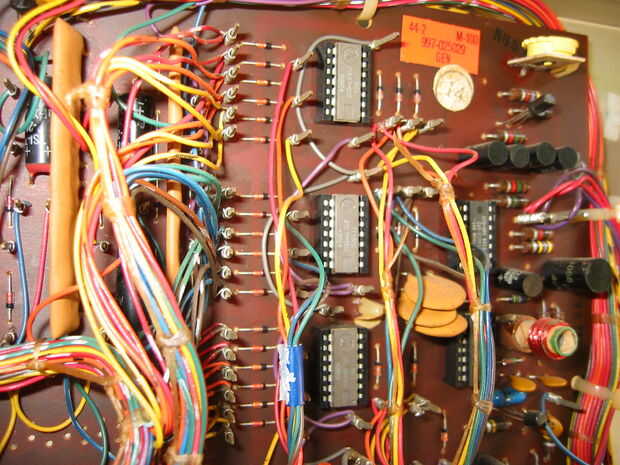 De todos modos, aquí es lo que las miradas de Lowrey dentro. Se ve muy bien puesto hacia fuera, pero uh-oh, cada conexión entre tarjetas es alambre-envuelve! Eso sería un dolor importante desarmar a tratar de arreglar.