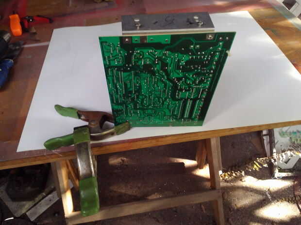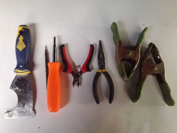 OK así que el 'menos de $10' en el título es asumiendo que tienes algunas herramientas comunes. En primer lugar necesitarás algo para quitar suavemente los componentes de la Junta como se derrite la soldadura con la pistola de calor. Yo uso una vieja herramienta de pintor pero bastará con cualquier herramienta de metal plana, rígida. Algo rígido y puntiagudo será útil para trabajar las piezas sueltas o enderezado dobló lleva antes de quitar una parte. Utilizar una válvula de aguja vieja de un motor fuera de borda. Un destornillador va a venir bien para quitar los disipadores de calor y otros componentes conectados tornillos. Una especie de tenazas y alicates de nariz también será útil. Finalmente tendrás un par de abrazaderas de resorte grande para sostener la Junta que está trabajando. No te preocupes las herramientas demasiado. Nada es demasiado crítico y herramientas pueden ser sustituidas o improvisadas. Un viejo cuchillo de mantequilla o cuchillo de paleta del artista funcionará igual de bien para levantar los componentes. Pinza de trabajo pesado funcionará casi como alicates de punta. Si no tienes pinzas para asegurar la placa a la tabla puede utilizar apretones o una abrazadera en c o incluso atornillar el tablero a la mesa a través de un par de agujeros de montaje de la Junta. Este es un trabajo rudo, sucio por lo que no utiliza tus mejores herramientas.