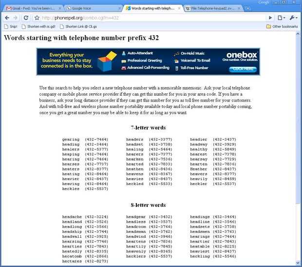 Tenemos 'Señor' y las combinaciones de números que le siguen. Entro en cada combinación de números que siguen a Phonespell.org para buscar buenas palabras llenar los últimos 6 dígitos de mi número de teléfono nuevo.