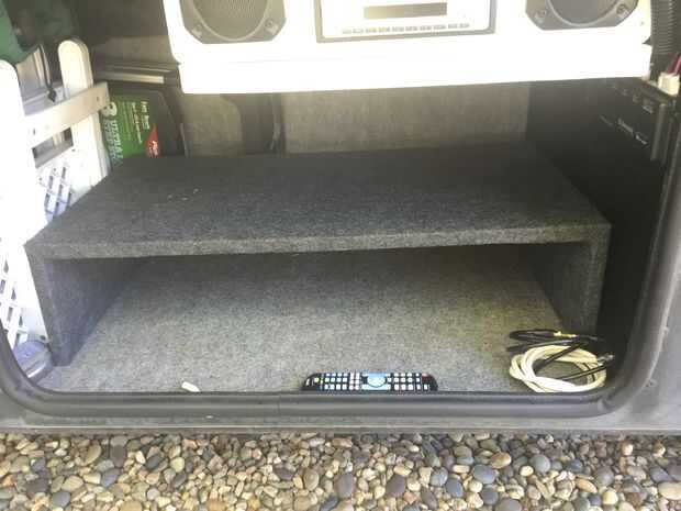 Construcción es bastante simple. Utilizar la madera para crear un estante que es sólo un poco más y un poco más alto que su TV. Vas a ser corredera TV debajo de la superficie para protegerlo y todavía tiene espacio para almacenar cosas sobre ella.