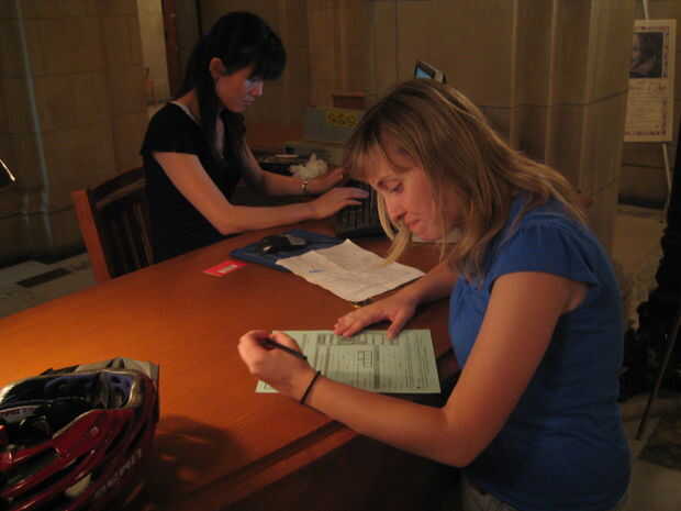 a pedir una tarjeta de biblioteca, un bibliotecario tomar las una o dos materias necesarias en el paso 2 y la mano una aplicación. Una página verde, tiempo de aplicación, pide su nombre, dirección y firma. Tarda unos 20 segundos para completar.