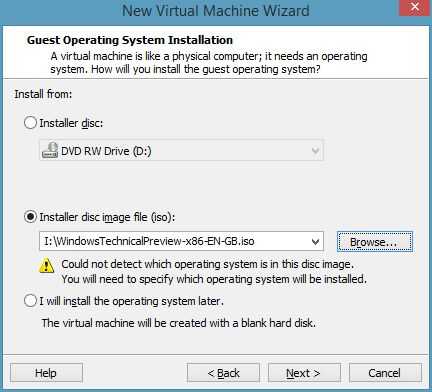 1. Inicie VMware Workstation 9, en el menú Archivo, seleccione Nueva Máquina Virtual. En el paso 1 del asistente de máquina Virtual nueva, seleccione la instalación típica. En el siguiente paso del asistente, seleccione el archivo de imagen de disco de instalación y punto el Windows 10 Tech Preview ISO que acabas de descargar. Puesto que esta versión de Tech Preview no es compatible, no puede ser detectado por el asistente. Haga clic en siguiente para continuar.