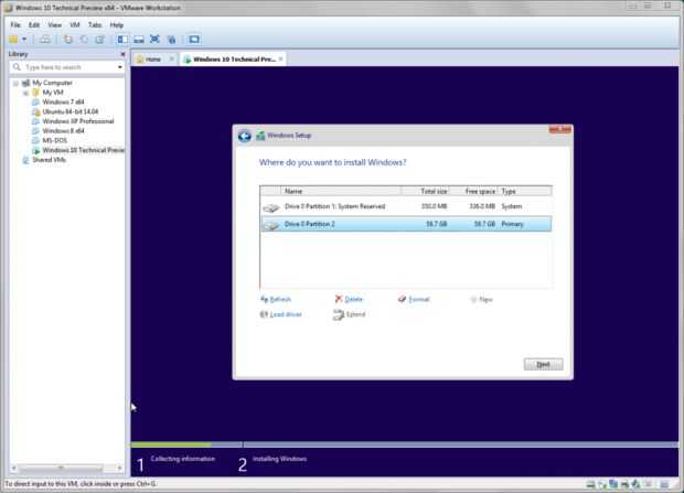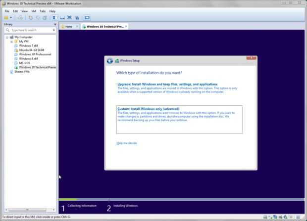 Siga las instrucciones del instalador de Windows para iniciar la instalación, en pocos minutos, tu Windows 10 Tech Preview estará listo dentro de VMware Workstation / jugador.