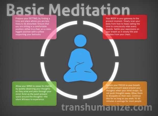 La meditación debe hacerse en un lugar tranquilo, pero no silencioso. Junto a un arroyo en primavera, o tal vez fuera en el bosque. Sentarse en cualquier posición pero cómodo, (piernas cruzadas, arrodillado, etc.) permanecer con la espalda recta, con el fin de mantener su mente de convertirse en sueño. Quedarse completamente inmóvil, pero no pensar en ello. Centrarse en tu respiración, dentro y fuera...