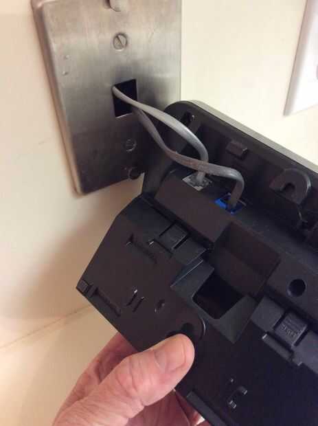 1. si están tratando de esconder el transformador y su cable, primero debe quitar el teléfono de su placa de fijación. Luego pase el alambre de peces a través del orificio de la placa y a través del espacio de la pared hasta la abertura en el gabinete de abajo. En mi caso tuve que quitar la placa de montaje de la pared porque el orificio de la placa era demasiado pequeño para los peces hacer la curva hacia abajo.