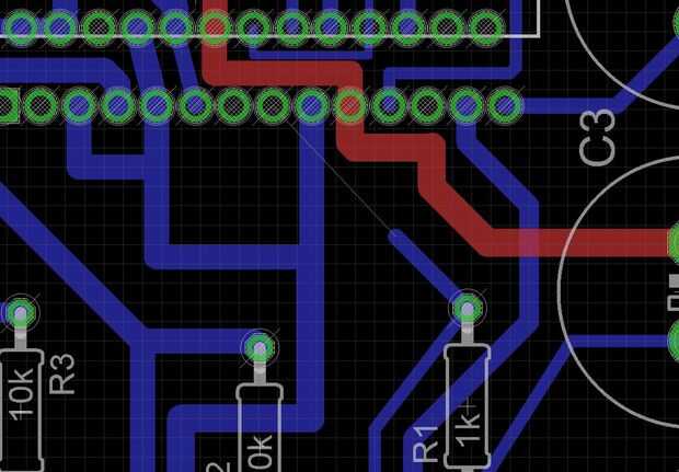 a menudo cuando está distribuyendo un alambre en Eagle PCB, llegar a un punto donde no se puede hacer una ruta para un componente como puede ser obstruida por otra ruta o tal vez un cojín. Si usted tiene un tablero con un montón de componentes en él, sería mucho tiempo para reorganizar para hacer espacio para este componente se enruten. En mi ejemplo que no quiero que pase un cable rojo como manera de cerca otro cable rojo que será la señal de tierra, es la señal con que estoy lidiando una señal de entrada quiero minimizar a cualquier tipo de interferencia (Figura 1).