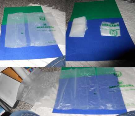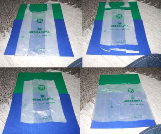 Aplana la bolsa. Corte la parte inferior de la bolsa que está sellada y la tajada de las asas.