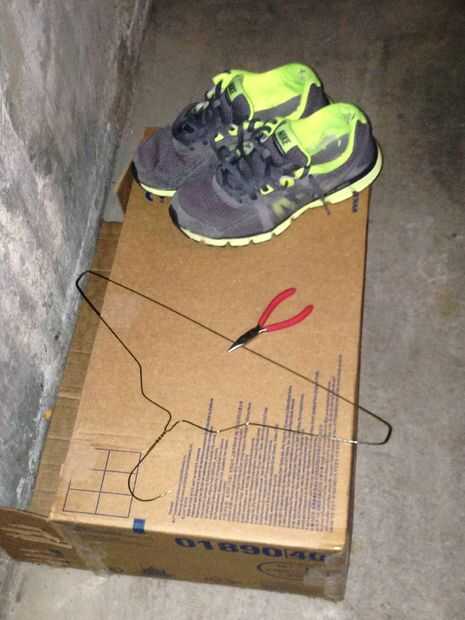 perchas de alambre, cortador de alambre, pintura de aerosol, zapatos