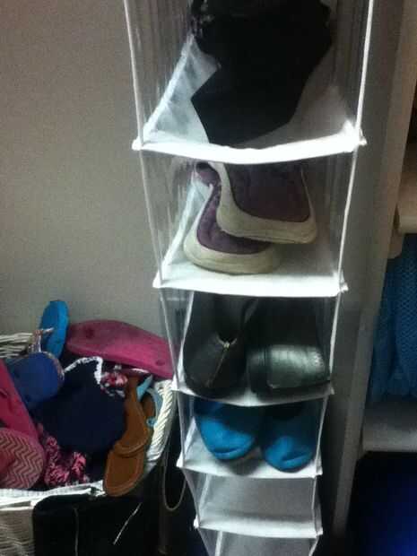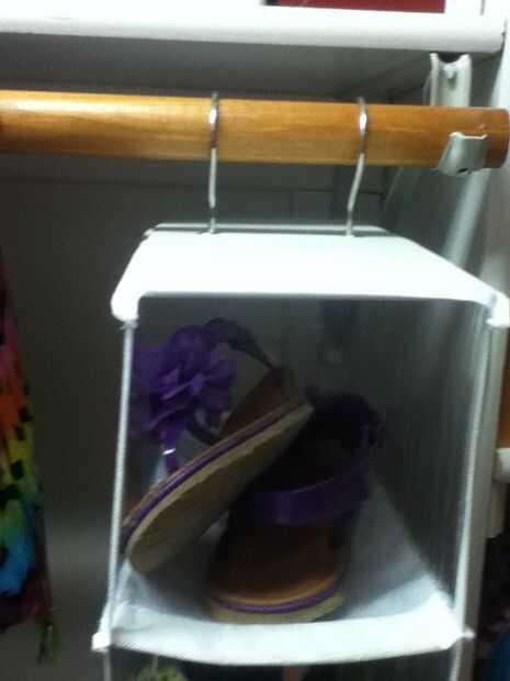Si ya tienes uno creo que es más fácil tener un organizador de zapatos para poner sus zapatos y se puede colgar en la barra para poner la ropa.