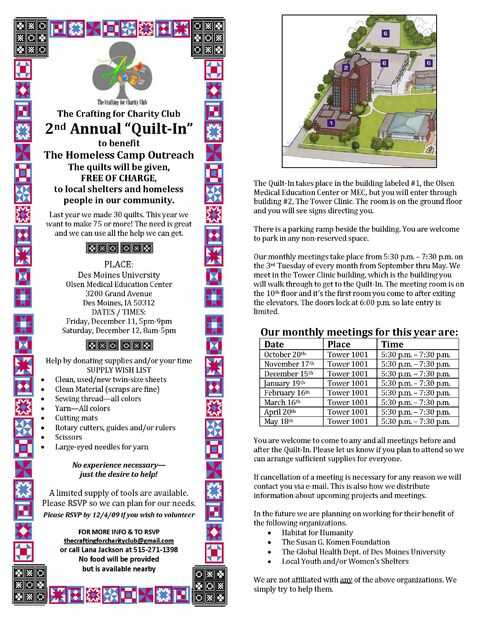 · Recomendamos que esto llevará a cabo en algún momento entre octubre y diciembre. Parece que la gente empieza a pensar en hacer obras de caridad durante este período de tiempo y es más fácil conseguir a voluntarios. · Hemos tenido un gran éxito haciendo nuestro evento durante 2 días. Hemos elegido la noche del viernes, después de trabajo y los sábados todo el día. Esto parece funcionar bien porque algunas personas les gusta seguir adelante y hacer este derecho después de trabajo entonces tiene el resto del fin de semana libre. También, ya que planeamos trabajar todo el día el sábado nosotros darles la oportunidad de entrar desde fuera de la ciudad a trabajar por un período significativo de tiempo. Por cierto, se trata de una gran actividad para los niños! · Póngase en contacto con sus estaciones locales de radio y televisión. Muchos anuncian su evento gratis. · Constituyen folletos que pueden dar a las iglesias, tiendas de abarrotes y tiendas de manualidades. Hemos encontrado que muchas empresas están muy dispuestos a ayudar con la publicidad y el apoyo de su evento como no les cuesta nada hacerlo. También, si usted está planeando en tener reuniones regulares para otras tareas, este es un buen momento para dejar que la gente sabe acerca de su organización. · Asegúrese de que incluir su lista de suministros necesarios en los volantes. (Prepararse para la inundación de suministros que va a venir!) o asegúrese de que usted en contacto con su local de Boy Scouts y Girl Scouts. Pueden conseguir divisas para ayudar con eventos como este. Si les das suficiente ADVERTENCIA que abruman con apoyo. o póngase en contacto con sus escuelas secundarias locales y clubes de estudiantes. Muchos de estos estudiantes buscan cosas llenar sus solicitudes universitarias. Se ve realmente muy bien si puede decir que ayudaron con un área de edredón-pulg (estar preparado para escribir una carta de recomendación para los estudiantes que vienen por lo que se puede incluir en sus archivos de la escuela).