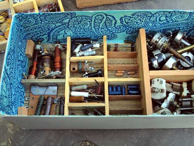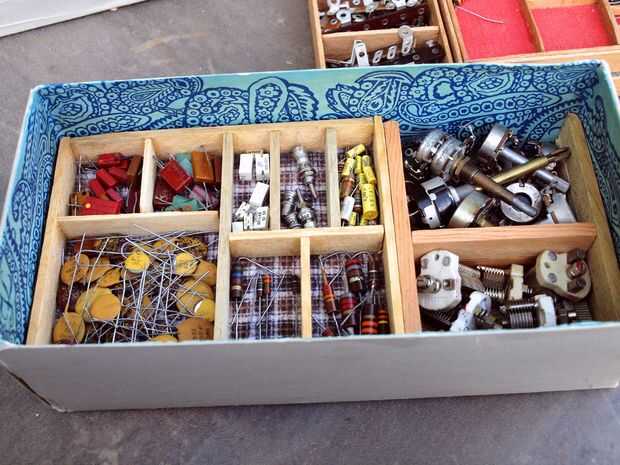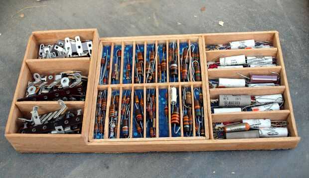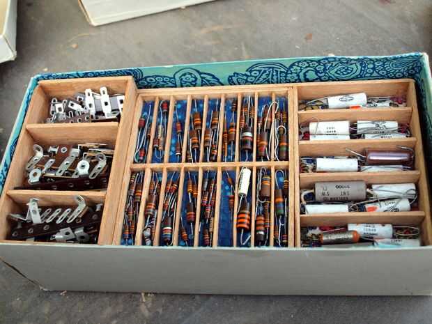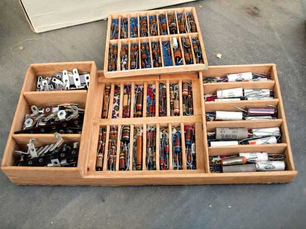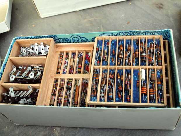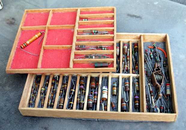 Yo solucione mi resistentes y ponerlos según el código del color que era cómo usted determina cuántos ohmios eran. Haciendo un montón de compartimentos poco podía almacenarlos en orden. Estos componentes no son pesados por lo que no era necesario hacer las cajas realmente fuertes.