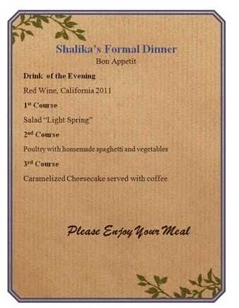 Creación de un menú puede ser un gran reto, pero lo que me ayudó es darse cuenta de lo que realmente quieres cocinar. Hay gente que puede hacer magia con verduras y hacer platos exquisitos con ellos, también hay personas que les gusta pasar horas marinar carne y especias para el pescado de elección. Después de decidir los alimentos que te gustaría hacer más hacen el curso principal, que es la parte más importante de la cena de gala, entonces el aperitivo puede ser algo le gusta o puede haber tenido en el anterior. Postre viene desde el corazón de cada individuo. Considerando que no podría estar obsesionado con el chocolate, alguien no podría imaginar la vida sin él.