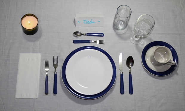 En esta foto concreta he mostrado un ejemplo de cómo poner una mesa. Voy a describir en detalle de izquierda a derecha todos los elementos