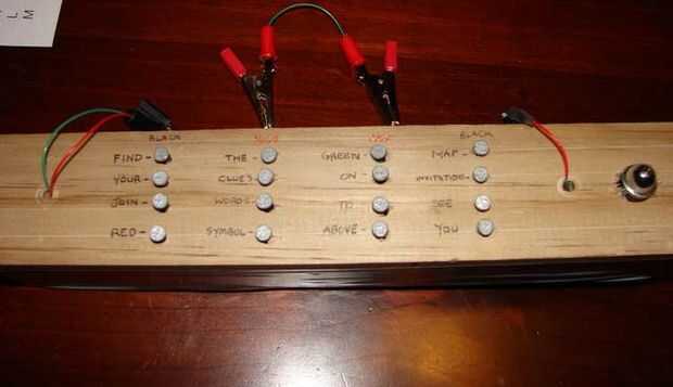 Pensé que un láser sería de spy-ish, así que compré un puntero láser desde la tienda de dólar. Hice una matriz de terminales de 16 clavos. Cada clavo fue etiquetado con la palabra. Las palabras compuestas por oraciones para ayudar a resolver esta pista;