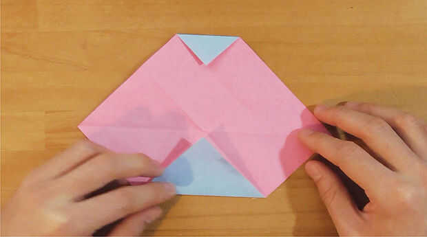 se necesita:-tijeras-una hoja de origami de 15cmx15cmPaso 1: Base Doblar las diagonales. Pellizcar el papel y doblar las esquinas dentro.Paso 2: Cuerpo de la mariposa Doblar la parte superior un poco sobre el borde. Dé vuelta. Abrir la tapa superior