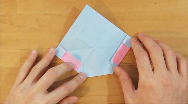se necesita:-tijeras-una hoja de origami de 15cmx15cmPaso 1: Base Doblar las diagonales. Pellizcar el papel y doblar las esquinas dentro.Paso 2: Cuerpo de la mariposa Doblar la parte superior un poco sobre el borde. Dé vuelta. Abrir la tapa superior