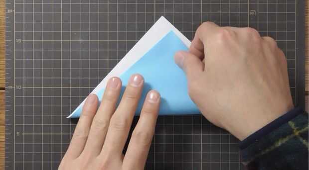 El lado blanco hacia arriba, doblar por la mitad diagonalmente y desdoblar.