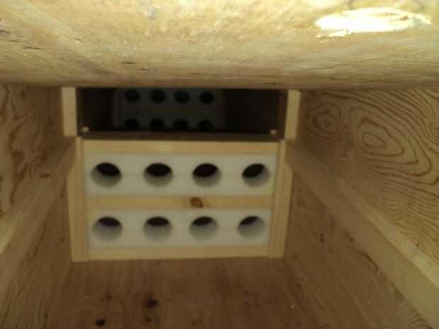 Los dos compartimientos son separados por una "piso" que se levanta de la madera contrachapada. El piso tiene pulgar-agujeros circulares perforados hacia fuera (con paredes lisas, sin astillas) permitiendo que un ser humano a levantar el piso en cualquier momento. El piso es apoyado en sus bordes por una moldeado-como la característica de madera de 1 x atornillada en la pared de la caja, justo debajo.