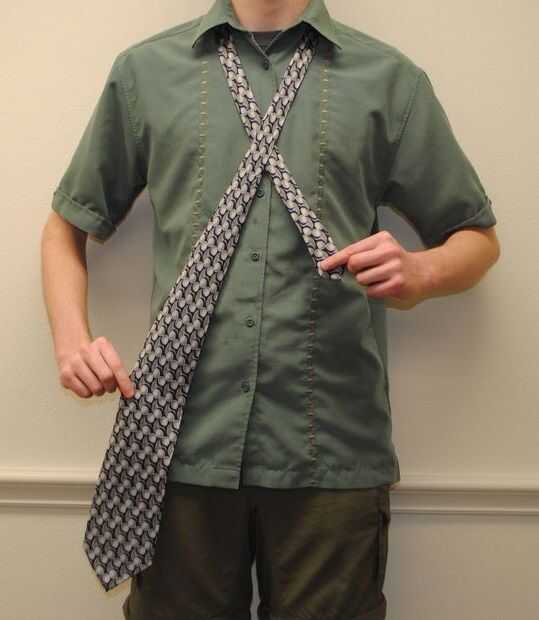Tomar el extremo ancho de la corbata y Cruz en el extremo estrecho de la corbata para que el extremo ancho es en el frente. Asegúrese de no cruzar los extremos de la corbata demasiado baja, pero no tan alto que no puede ver lo que haces o vas apretando el nudo en el extremo y si se ata demasiado baja, el extremo estrecho podría extenderse más allá del extremo ancho y el nudo debe ser jubilados.