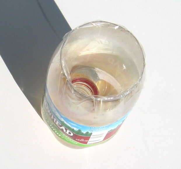 Para hacerlo, corte la parte superior de una botella de refresco e insertar en la parte restante invertida. Cinta o hotglue en lugar. Colocar algún cebo líquido en la parte inferior.