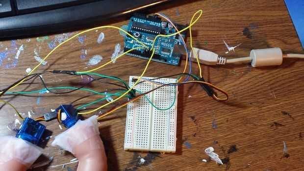 - Por último Conecte uno de los hilos del cable puente negro al cable negro que se extiende desde uno de los servos.