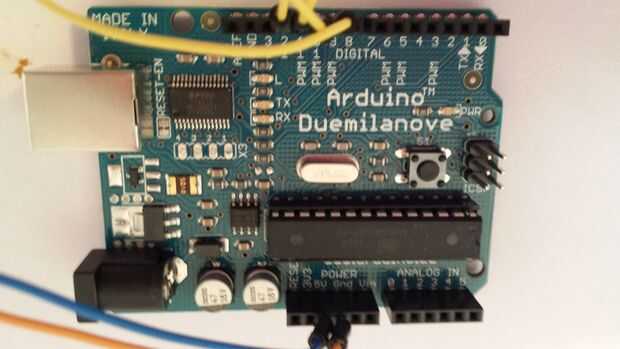 - Tomar uno de los cables cable de puente amarillo y conecte al pin 9, luego conecte uno al pin 10, en pluma de once y el último cable de puente amarillo cable a pin doce en los alfileres de salida digital de la placa de arduino duemilanove.