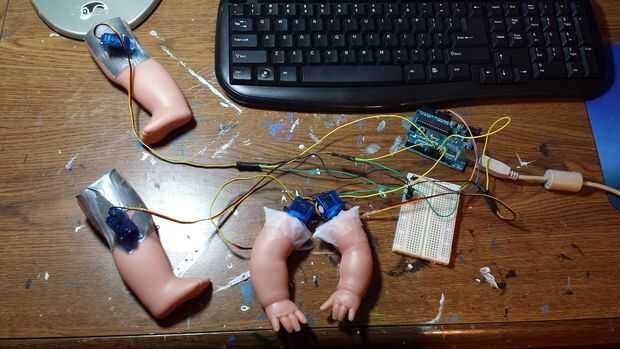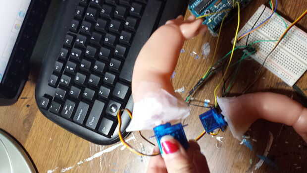 - Tomar los otros dos servos e insertarlos en cualquier brazo. Una vez más, una vez que se fija el servo, sello los brazos con cinta adhesiva.