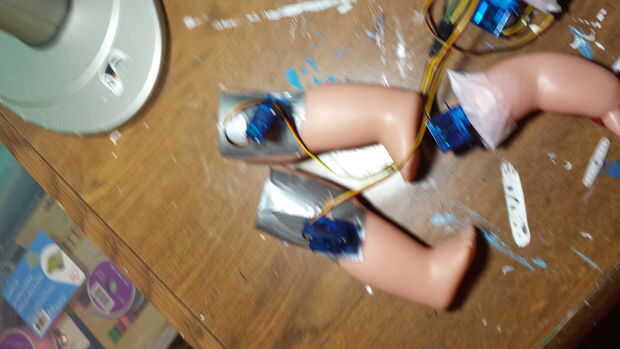 - Una vez que ambos servos están dentro de una de las patas, sellar cada pata con cinta aislante.