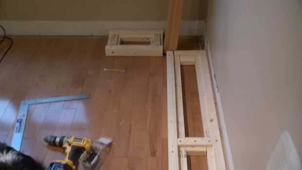 Era tiempo de construir la base y los estantes fijados a él. Nos atornillada a los montantes de la pared evitando dañar la madera por debajo. Con la altura perfecta, ponemos la placa base sobre lo que es como un hermoso incorporado.