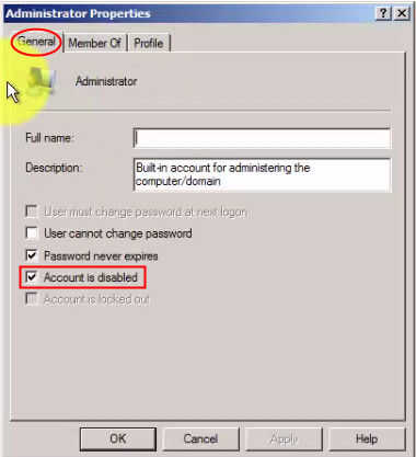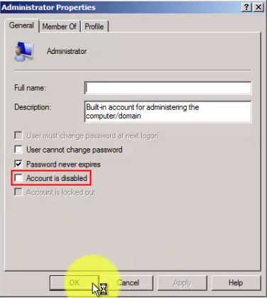 -Si está marcada la casilla de verificación de cuenta está deshabilitada , significa cuenta de administrador ha desactivar