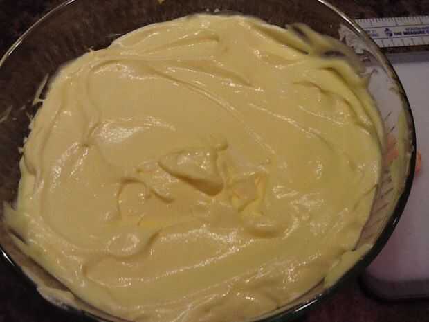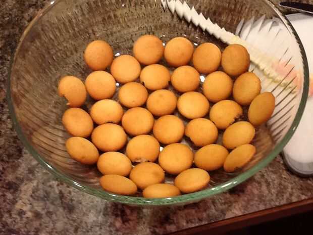 Ahora es el momento para hacer el tazón de fuente. Primero se ponen las obleas de vainilla para la primera capa. A continuación, agregue una capa de pudín de plátano (usar la mitad de la morcilla).