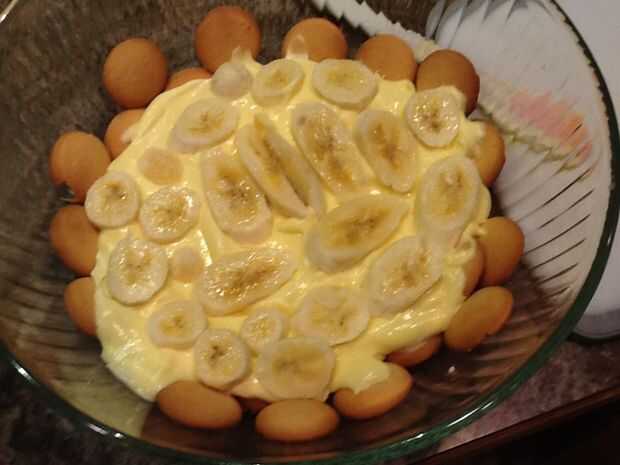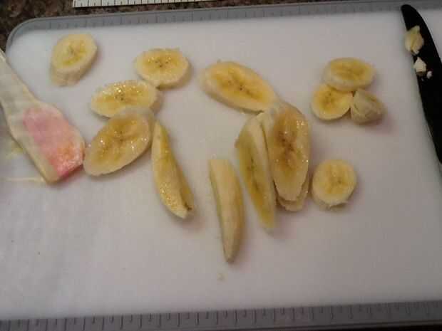 a continuación cortar los plátanos en rodajas de pulgadas de trimestre, cubren la parte superior de la morcilla con una sola capa de plátanos.