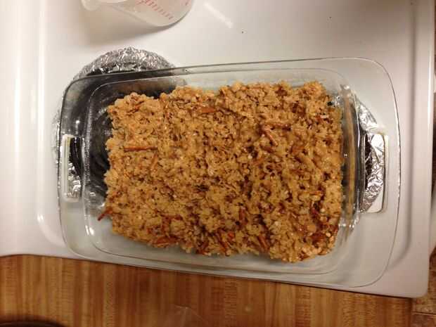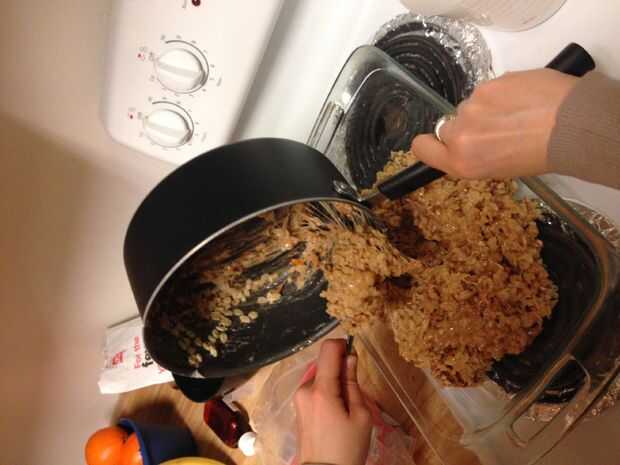 Tomar 13 x 9 engrasado de la cacerola y vierta mezcla crujiente de arroz. PAT hacia abajo uniformemente de grueso uniforme.