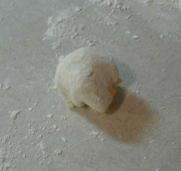 1.) toma 1/2" a 3/4 bola de masa y dentro de la estación de harina