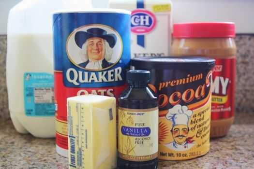 Los ingredientes necesarios son: mantequilla 1 barra 1/2 taza de leche 2 tazas de azúcar 1/2 taza cacao en polvo (mejor los trabajos de Hershey) 2 cucharaditas de extracto de vainilla 1/2 taza mantequilla de maní 3 tazas oats de Quaker