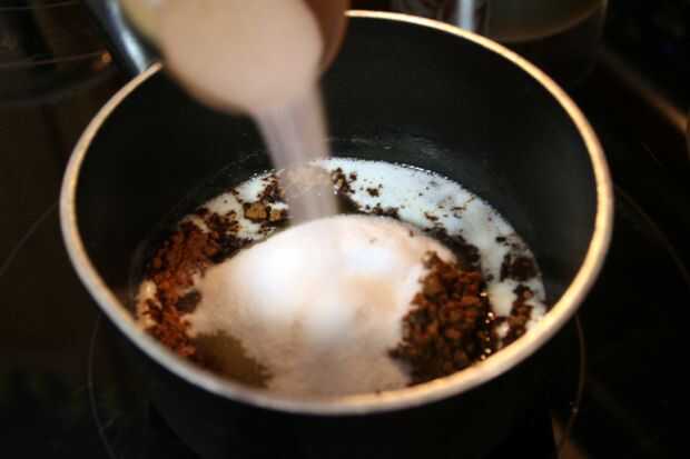 1. Mezcle la leche, el azúcar y el cacao en polvo en una cacerola. Poner a fuego medio y revuelva.